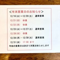 年末営業日のお知らせです 12/21(日)、12/22(月)、12/28(日) は休業です。 12/31(水) は10:00〜17:00 です。 年始の営業開始日は決まり次第お知らせします。