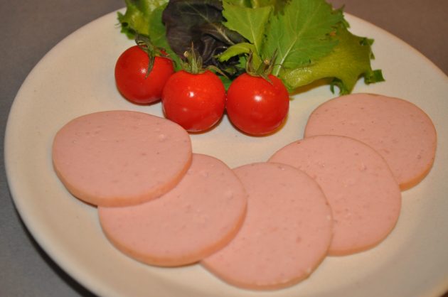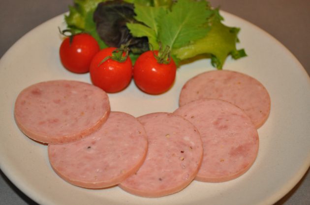 原材料:豚肉、牛肉、食塩、砂糖、玉ねぎ、香辛料、調味料(アミノ酸等)、発色剤(亜硝酸Na)、リン酸塩(Na、K)、酸化防止剤(V.C)