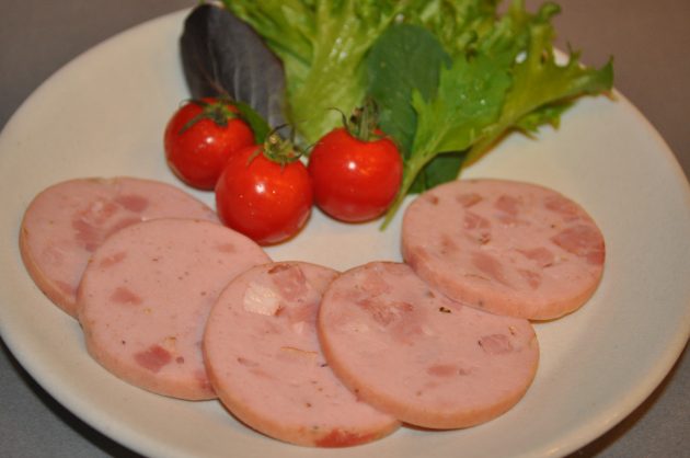 玉ねぎのみじん切りが入った四角いソーセージ。